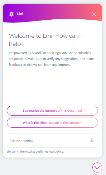 <p><strong>Ask Lini</strong> is your trusted AI partner inside the DiliTrust Suite — ready to summarize, translate, and analyze information in seconds. It brings intelligence and efficiency to your legal and governance workflows, while ensuring full security and compliance ⚡.</p>